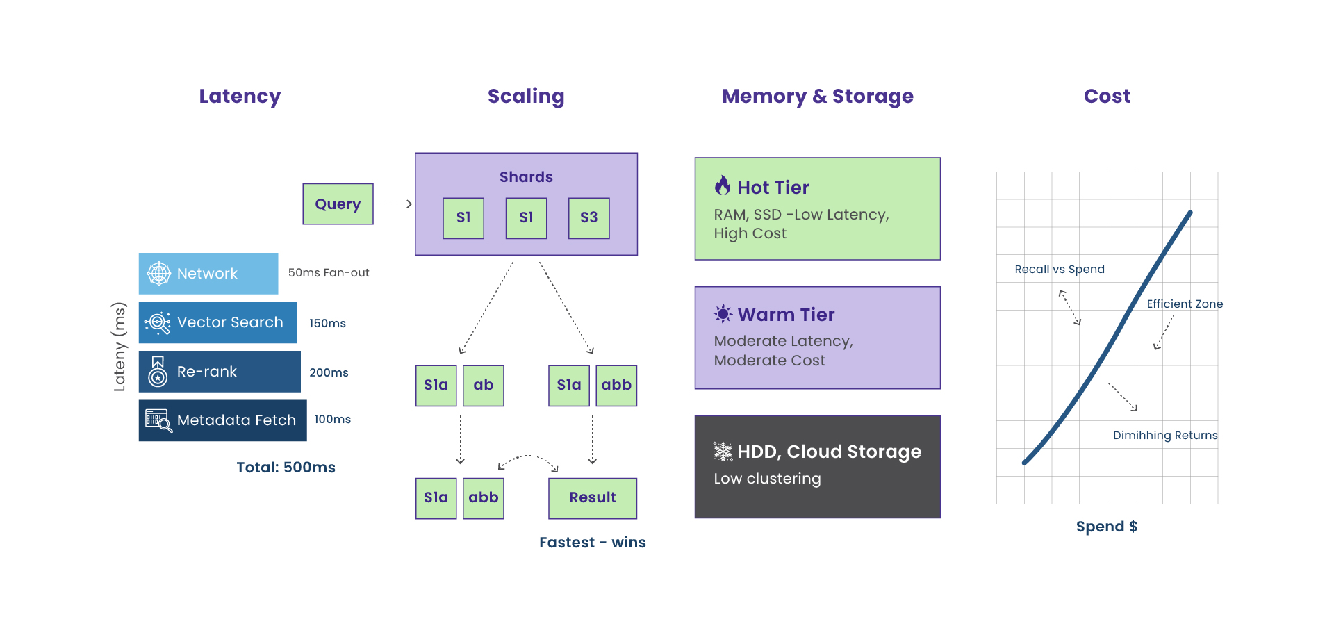 Vector-native search now powers many retrieval and reasoning workloads. As teams scale from prototypes to production, three constraints dominate: latency at user-facing percentiles, the ability to scale under concurrency, and the cost of memory, compute, and network. This article presents a practical blueprint for engineers who need to deliver consistent recall within a strict latency budget while keeping spend predictable. It explains how common index families behave, how to shard and replicate, how to lay out embeddings in memory, how to combine metadata filters with vector search, how to benchmark honestly, and how to tune for high concurrency. The goal is an architecture that meets service level objectives with clear dials and measurable trade-offs.