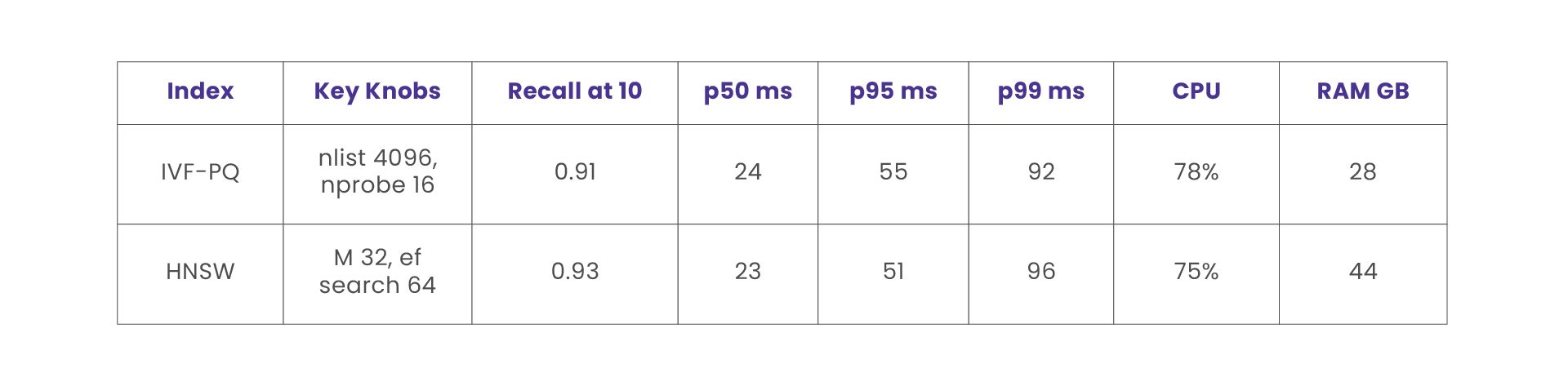 For ten million vectors of seven hundred and sixty eight dimensions at five hundred queries per second, a common starting point on central processing unit is IVF-PQ with nlist around four thousand and nprobe between sixteen and thirty two. When memory allows and updates are frequent, HNSW with M around thirty two and ef construction around two hundred is a solid choice, and ef search around sixty four is a useful first setting. If the corpus is small, a Flat index on graphics processing unit can provide exact recall with excellent latency.