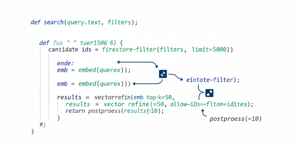 Many applications combine metadata filtering with approximate nearest neighbour search. A common pattern filters candidates in Firestore and then refines the results in FAISS or Pinecone. Consistency matters. Denormalize critical filters next to the vector reference so that a single document contains both the metadata and the vector identifier. When a query arrives, run the metadata filter to narrow the candidate set, embed the text, and then run the vector search constrained to those candidates. If the metadata system is slow or temporarily overloaded, fall back to a conservative query that returns safe defaults.