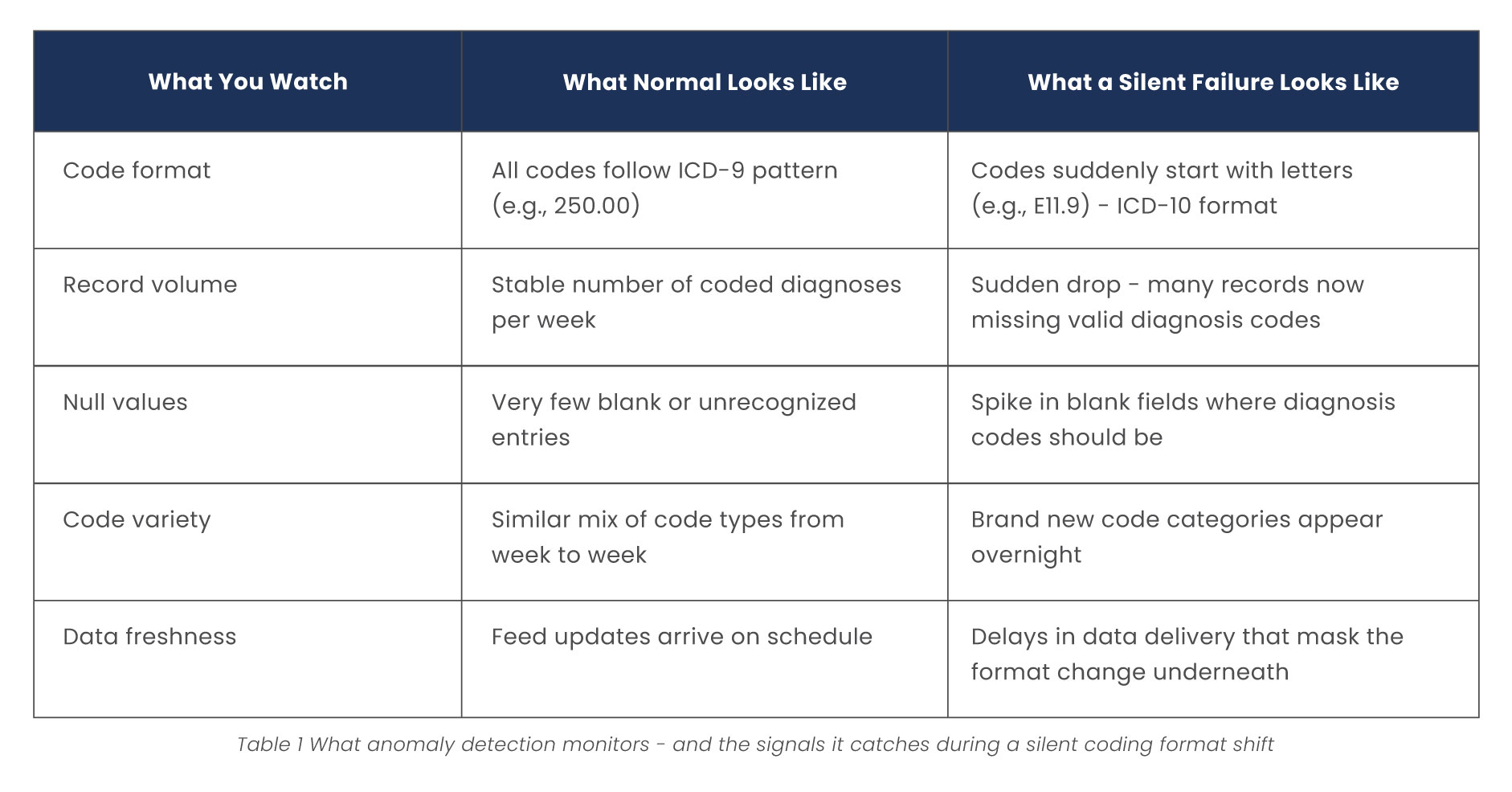 When anomaly detection flags a coding shift early, data teams can quarantine affected records, confirm the transition date with the hospital, apply the right code mapping, and tag the records so analysts know to handle them with care. Clean, trustworthy data gets restored quickly – often before any study is impacted.